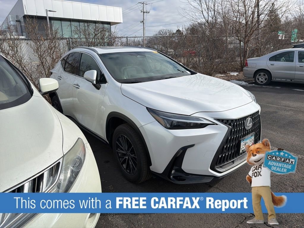This NX is well equipped with L/Certified Certified, 10 Speakers, 18 Wheels, 4-Wheel Disc Brakes, ABS brakes, Air Conditioning, Alloy wheels, AM/FM radio: SiriusXM, Anti-whiplash front head restraints, Auto High-beam Headlights, Auto tilt-away steering wheel, Auto-dimming door mirrors, Auto-dimming Rear-View mirror, Automatic temperature control, Brake assist, Bumpers: body-color, Delay-off headlights, Driver door bin, Driver vanity mirror, Dual front impact airbags, Dual front side impact airbags, Electronic Stability Control, Emergency communication system: Safety Connect (up to 10-year trial subscription included), Exterior Parking Camera Rear, Four wheel independent suspension, Front anti-roll bar, Front Bucket Seats, Front Center Armrest, Front dual zone A/C, Front fog lights, Front reading lights, Fully automatic headlights, Garage door transmitter: HomeLink, Heated & Ventilated Front Bucket Seats, Heated door mirrors, Heated front seats, Illuminated entry, Knee airbag, Leather Shift Knob, Leather steering wheel, Low tire pressure warning, Memory seat, Navigation system: Drive Connect Cloud Navigation (subscription required), NuLuxe Seat Trim, Occupant sensing airbag, Outside temperature display, Overhead airbag, Overhead console, Panic alarm, Passenger door bin, Passenger vanity mirror, Power door mirrors, Power driver seat, Power Liftgate, Power moonroof, Power passenger seat, Power steering, Power windows, Radio data system, Rain sensing wipers, Rear anti-roll bar, Rear reading lights, Rear seat center armrest, Rear window defroster, Rear window wiper, Remote keyless entry, Security system, Speed control, Speed-sensing steering, Speed-Sensitive Wipers, Split folding rear seat, Spoiler, Steering wheel memory, Steering wheel mounted audio controls, Tachometer, Telescoping steering wheel, Tilt steering wheel, Traction control, Trip computer, Turn signal indicator mirrors, Variably intermittent wipers, Ventilated front seats, and Wireless Apple CarPlay/Wireless Android Auto.