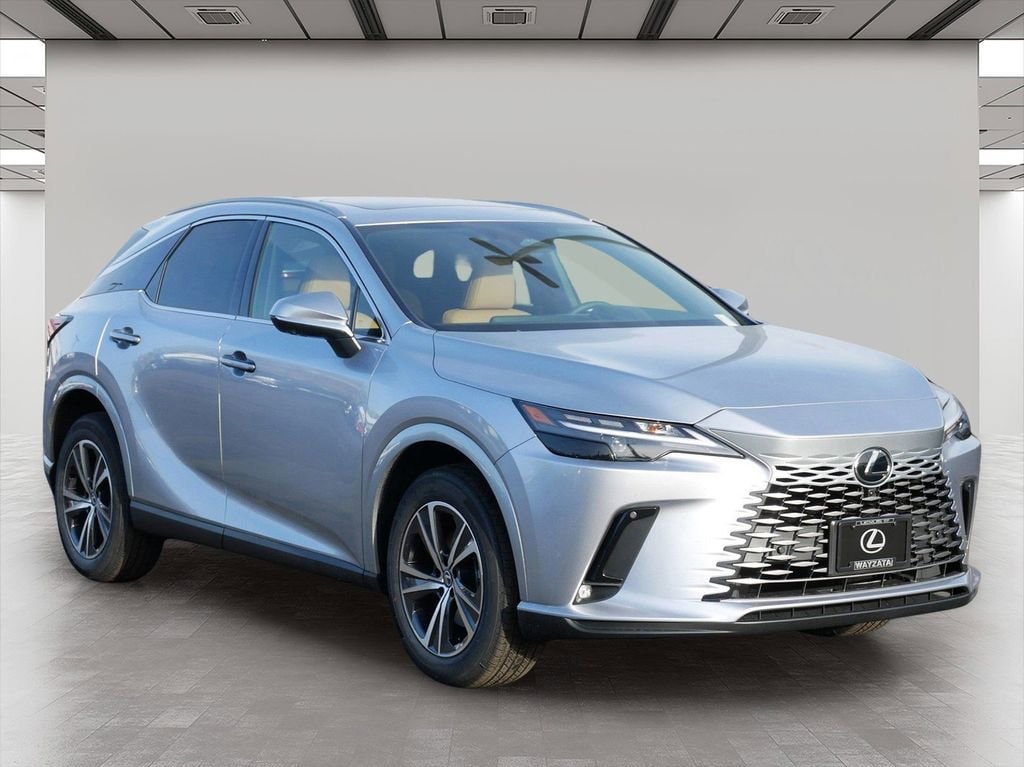 This RX is well equipped with Accessory Package, Convenience Package (Front Cross-Traffic Alert, Panoramic View Monitor, and Traffic Jam Assist), Premium Grade, AWD, Ea42 Palomino Artificial Leather, 12 Speakers, 19 5-Spoke Alloy Wheels, 4-Wheel Disc Brakes, ABS brakes, Air Conditioning, All-Weather Cargo Mat, All-Weather Floor Liners, Alloy wheels, AM/FM radio: SiriusXM, Anti-whiplash front head restraints, Auto High-beam Headlights, Auto tilt-away steering wheel, Auto-dimming door mirrors, Auto-dimming Rear-View mirror, Automatic temperature control, Black Emblem Overlays, Brake assist, Bumpers: body-color, Cargo Net, Compass, Delay-off headlights, Door Edge Guards, Driver door bin, Driver vanity mirror, Dual front impact airbags, Dual front side impact airbags, Electronic Stability Control, Emergency communication system: Safety Connect (5-year minimum), Exterior Parking Camera Rear, Four wheel independent suspension, Front anti-roll bar, Front Bucket Seats, Front Center Armrest, Front dual zone A/C, Front fog lights, Front reading lights, Fully automatic headlights, Garage door transmitter: HomeLink, Genuine wood console insert, Heated and Ventilated Front Seats, Heated door mirrors, Heated front seats, Heated steering wheel, Illuminated entry, Key Gloves, Leather Shift Knob, Leather steering wheel, Lexus Interface with 14 Touchscreen Display, Lexus Interface with 9.8 Touchscreen Display, Low tire pressure warning, Memory seat, Navigation System, NuLuxe Seat Trim, Occupant sensing airbag, Outside temperature display, Overhead airbag, Overhead console, Panic alarm, Passenger door bin, Passenger vanity mirror, Power door mirrors, Power driver seat, Power Liftgate, Power passenger seat, Power Rear Door with Kick Sensor, Power steering, Power windows, Radio data system, Radio: 12-Speaker Lexus Premium Sound System, Rain sensing wipers, Rear air conditioning, Rear anti-roll bar, Rear reading lights, Rear seat center armrest, Rear side impact airbag, Rear window defroster, Rear window wiper, Remote keyless entry, Security system, Speed control, Speed-sensing steering, Split folding rear seat, Spoiler, Steering wheel memory, Steering wheel mounted audio controls, Tachometer, Telescoping steering wheel, Tilt steering wheel, Traction control, Trip computer, Turn signal indicator mirrors, Variably intermittent wipers, Ventilated front seats, Wheel Locks, Wheels: 21 20-Spoke Alloy, and Wireless Apple CarPlay/Wireless Android Auto.