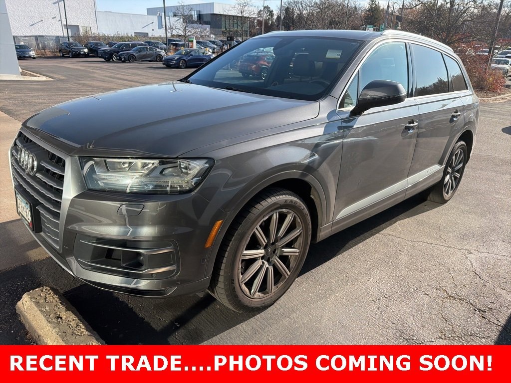 This Q7 is well equipped with 10 Speakers, 3.204 Axle Ratio, 3rd row seats: bench, 4-Wheel Disc Brakes, ABS brakes, Air Conditioning, Alloy wheels, AM/FM radio: SiriusXM, Audi smartphone interface (Apple CarPlay/Android Auto), Auto-dimming door mirrors, Auto-dimming Rear-View mirror, Automatic temperature control, Brake assist, Bumpers: body-color, CD player, Compass, Delay-off headlights, Driver door bin, Driver vanity mirror, Driver's Seat Mounted Armrest, Dual front impact airbags, Dual front side impact airbags, Electronic Stability Control, Emergency communication system: Audi connect CARE, Four wheel independent suspension, Front anti-roll bar, Front Bucket Seats, Front dual zone A/C, Front fog lights, Front reading lights, Fully automatic headlights, Garage door transmitter: HomeLink, Heated door mirrors, Heated Front Bucket Seats, Heated front seats, Illuminated entry, Leather Seating Surfaces, Leather Shift Knob, Leather steering wheel, Low tire pressure warning, Memory seat, Navigation system: MMI Navigation plus, Occupant sensing airbag, Outside temperature display, Overhead airbag, Panic alarm, Passenger door bin, Passenger seat mounted armrest, Passenger vanity mirror, Power door mirrors, Power driver seat, Power Liftgate, Power moonroof, Power passenger seat, Power steering, Power windows, Radio data system, Radio: Audi MMI Navigation Plus, Rain sensing wipers, Rear air conditioning, Rear anti-roll bar, Rear fog lights, Rear reading lights, Rear seat center armrest, Rear window defroster, Rear window wiper, Remote keyless entry, Roof rack: rails only, Security system, Speed control, Speed-sensing steering, Split folding rear seat, Spoiler, Steering wheel memory, Steering wheel mounted audio controls, Tachometer, Telescoping steering wheel, Tilt steering wheel, Traction control, Trip computer, Turn signal indicator mirrors, Variably intermittent wipers, and Wheels: 20 10-Spoke-Star Design Bi-Color.
