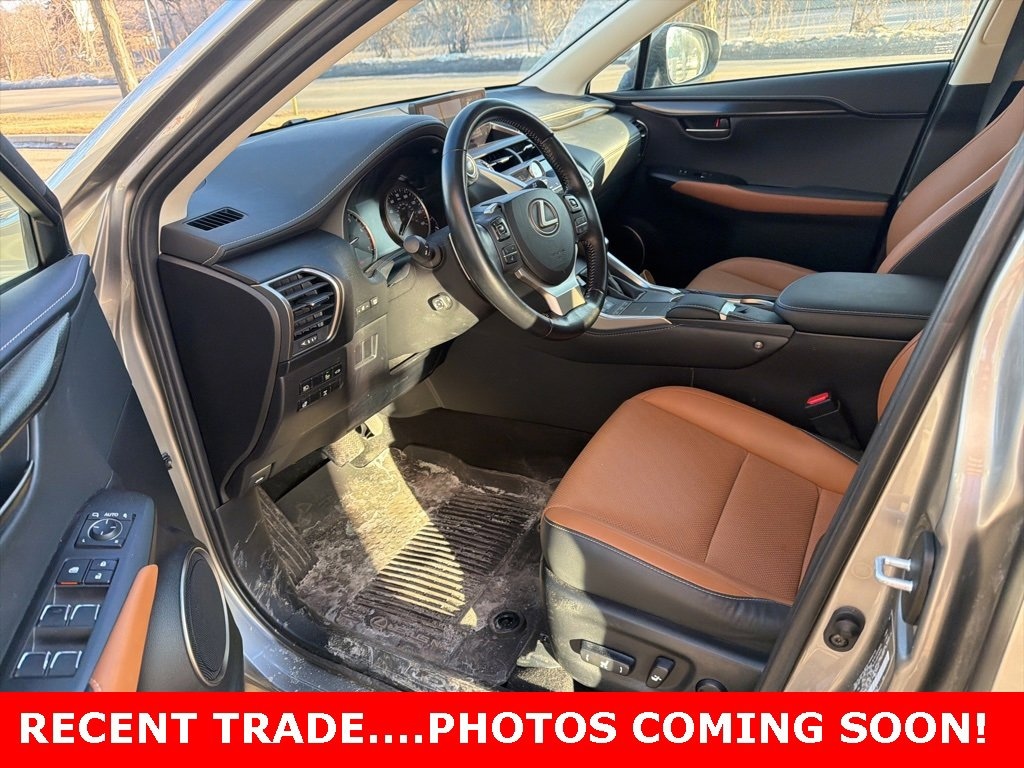 This NX is well equipped with 17 x 7 Alloy Wheels, 4-Wheel Disc Brakes, 8 Speakers, ABS brakes, Air Conditioning, Alloy wheels, AM/FM radio: SiriusXM, Auto High-beam Headlights, Automatic temperature control, Axle Ratio: 3.888, Brake assist, Bumpers: body-color, CD player, Compass, Delay-off headlights, Driver door bin, Driver vanity mirror, Dual front impact airbags, Dual front side impact airbags, Electronic Stability Control, Emergency communication system: Lexus Enform w/Safety Connect, Enform Wi-Fi, Exterior Parking Camera Rear, Four wheel independent suspension, Front anti-roll bar, Front Bucket Seats, Front Center Armrest, Front dual zone A/C, Front fog lights, Front reading lights, Fully automatic headlights, Heated door mirrors, High Clearance Lamp, Illuminated entry, Knee airbag, Leather Shift Knob, Leather steering wheel, Low tire pressure warning, NuLuxe Seat Trim, Occupant sensing airbag, Outside temperature display, Overhead airbag, Overhead console, Panic alarm, Passenger door bin, Passenger vanity mirror, Power door mirrors, Power driver seat, Power passenger seat, Power steering, Power windows, Radio data system, Radio: AM/FM/CD Lexus Display Audio, Rear anti-roll bar, Rear seat center armrest, Rear window defroster, Rear window wiper, Remote keyless entry, Roof rack: rails only, Security system, Speed control, Speed-sensing steering, Split folding rear seat, Spoiler, Steering wheel mounted audio controls, Tachometer, Telescoping steering wheel, Tilt steering wheel, Traction control, Trip computer, Turn signal indicator mirrors, and Variably intermittent wipers.