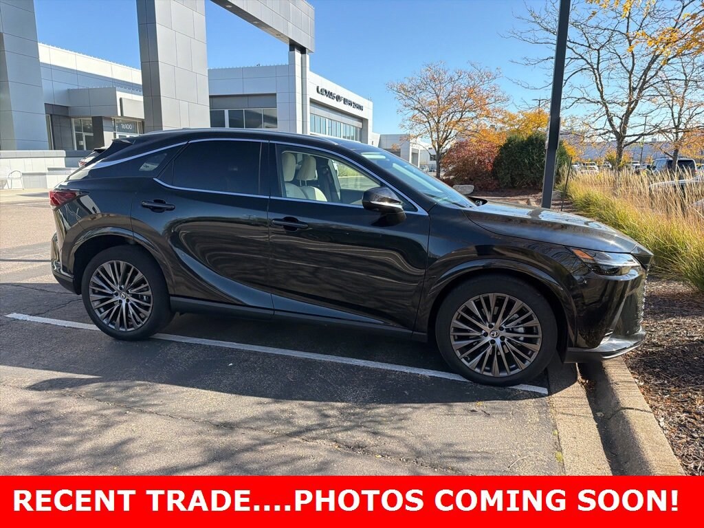 This RX is well equipped with AWD, 10-Way Power Driver & Fr Passenger Seat Adjusters, 12 Speakers, 3.33 Axle Ratio, 4-Wheel Disc Brakes, ABS brakes, Air Conditioning, Alloy wheels, AM/FM radio: SiriusXM, Anti-whiplash front head restraints, Auto High-beam Headlights, Auto tilt-away steering wheel, Auto-dimming door mirrors, Auto-dimming Rear-View mirror, Automatic temperature control, Brake assist, Bumpers: body-color, Compass, Delay-off headlights, Driver door bin, Driver vanity mirror, Dual front impact airbags, Dual front side impact airbags, Electronic Stability Control, Emergency communication system: Safety Connect (10-year trial), Exterior Parking Camera Rear, Finish Plate Door Inner Garnish, Four wheel independent suspension, Front anti-roll bar, Front Bucket Seats, Front Center Armrest, Front dual zone A/C, Front fog lights, Front reading lights, Fully automatic headlights, Garage door transmitter: HomeLink, Genuine wood console insert, Heads-Up Display, Heated & Ventilated Front Bucket Seats, Heated door mirrors, Heated front seats, Heated steering wheel, Illuminated entry, Leather Shift Knob, Leather steering wheel, Low tire pressure warning, Memory seat, Multi-Color Illuminated Entry System, Navigation System, Occupant sensing airbag, Outside temperature display, Overhead airbag, Overhead console, Panic alarm, Parking Support Alert/Brake, Passenger door bin, Passenger vanity mirror, Power door mirrors, Power driver seat, Power Liftgate, Power moonroof, Power passenger seat, Power steering, Power windows, Radio data system, Radio: Lexus Interface w/14 HD Touchscreen Display, Rain sensing wipers, Rear air conditioning, Rear anti-roll bar, Rear reading lights, Rear seat center armrest, Rear side impact airbag, Rear window defroster, Rear window wiper, Remote keyless entry, Security system, Semi-Aniline/Synthetic Suede Leather Seat Trim, Speed control, Speed-sensing steering, Split folding rear seat, Spoiler, Steering wheel memory, Steering wheel mounted audio controls, Tachometer, Telescoping steering wheel, Tilt steering wheel, Traction control, Trip computer, Turn signal indicator mirrors, Variably intermittent wipers, Wheels: 21, Wireless Apple CarPlay/Wireless Android Auto, Wireless Charger, and Wood Steering Wheel w/Paddle & Heater.
